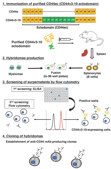 A BALB/c mouse was immunized with CD44ec (150 μg) intraperitoneally (i.p.) with Imject Alum (Thermo Fisher Scientific Inc.). The procedure included three additional immunizations with CD44ec (2nd immunization, 150 μg; 3rd immunization, 100 μg; 4th immunization, 50 μg) followed by a final booster injection of CD44ec (50 μg) two days prior to the harvest of splenic cells.