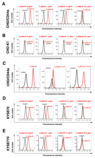 Flow cytometry to CD44 expressing cells using C44Mab−46. (A,B) CHO/CD44s (A) and CHO−K1 (B) cells were treated with 0.01–10 µg/mL of C44Mab−46, followed by treatment with Alexa Fluor 488−conjugated anti−mouse IgG. (C) C44Mab−46 (1 μg/mL), C44Mab−46 (1 μg/mL) plus human CD44 peptide (161−180 amino acids, WT) or alanine−substituted peptide (D175A) (10 μg/mL), and control (blocking buffer) were reacted with CHO/CD44 cells for 30 min at 4 °C, followed by treatment with Alexa Fluor 488−conjugated anti−mouse IgG. (D,E) KYSE70 (D) and KYSE770 (E) cells were treated with 0.01–10 µg/mL of C44Mab−46, followed by treatment with Alexa Fluor 488−conjugated anti−mouse IgG. The black line represents the negative control (blocking buffer).