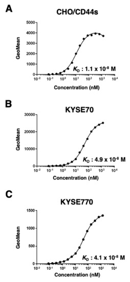 Next, we assessed the binding affinity of C44Mab−46 with CHO/CD44s, KYSE70, and KYSE770 using flow cytometry. The apparent KD of C44Mab−46 for CHO/CD44s, KYSE70, and KYSE770 was 1.1 × 10−8 M, 4.9 × 10−8 M, and 4.1 × 10−8 M, respectively, indicating that C44Mab−46 possesses moderate affinity for CD44s−expressing cells (Figure 3).