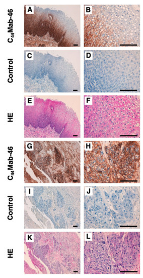 Immunohistochemical analysis using C44Mab−46 against ESCC tissues. (A–D,G–J) After antigen retrieval, sections were incubated with 5 µg/mL of C44Mab−46 or negative control (blocking buffer) followed by treatment with the Envision+ kit. Color was developed using DAB, and sections were counterstained with hematoxylin. (E,F,K,L) Hematoxylin and eosin (HE) staining. Scale bar = 100 µm.
