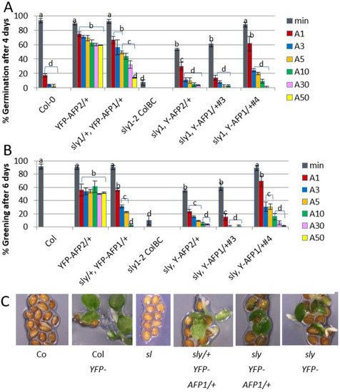 Effects of overexpressing YFP-AFP fusions in wild-type (Col-0) vs. sly1 mutants on ABA sensitivity of seeds. (A) Germination of the indicated genotypes after 4 days on media with no ABA (min) or 1–50 μM ABA (A1–A50). (B) Greening of the germinated seedlings after 6 days on the media described in (A). Data displayed is the average of at least triplicate assays for each genotype and treatment + S.E. Bars with different letters represent statistically different values using Tukey’s HSD post hoc test (p < 0.01). (C) Representative images of seeds/seedlings after 6 days on 5 μM ABA.
