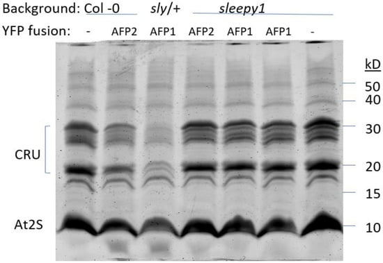 During seed development, the ABI transcription factors mediate ABA-promoted accumulation of storage proteins and lipids. Recently, RGL3 was shown to be the major DELLA protein expressed in maturing seeds, where it promotes the expression of the cruciferin and At2S families of storage proteins [35]. Consistent with this, we found a slightly increased accumulation of these proteins in the sly1 mutant background (Figure 3, lane 7). Transgenic lines overexpressing either AFP reduced accumulation of the storage proteins (Figure 3, lanes 2 and 3), with those in the sly1 background again showing an intermediate phenotype (Figure 3, lanes 4–6).