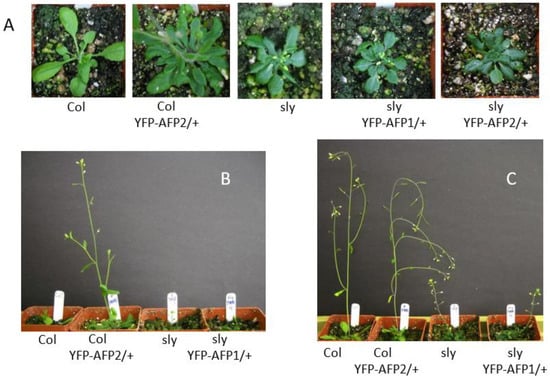 Effects of overexpressing YFP-AFP fusions in wild-type (Col-0) vs. sly1 mutants on vegetative growth. (A,B) Five-week old plants, (C) seven-week old plants.