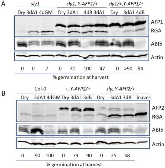 Immunoblot comparison of AFP, DELLA (RGA), and ABI5 protein accumulation in seeds and seedlings. Proteins were extracted from dry seeds or after 3d stratification, followed by 3d on GM + 1 μM ABA (3dA1) or 4d on GM, supplemented with BASTA (4dB) for the transgenic lines. Actin was used as a loading control. (A) Comparison of sly1 background (lanes 1–3) with YFP-AFP1 transgenic line #3 (lanes 4–6) or line #4 (lane 7) or the F2 from the backcross of YFP-AFP1#3 to Col-0 (lanes 8-10). (B) Comparison of wild-type (Col-0) (lanes 1–3), YFP-AFP2 in wild type (lanes 4–6), or sly1 backgrounds (lanes 7–10). Extract from rosette leaves is in lane 10.