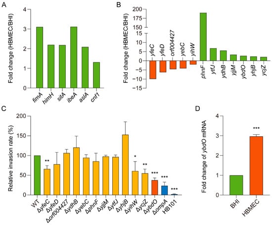 Significant upregulation of ybdO expression following E. coli K1 invasion of HBMECs. (A) Fold change in the fragments per kilobase of transcript per million fragments mapped (FPKM) of representative differentially expressed toxic genes. (B) Fold change in the FPKM of putative transcriptional regulators. (C) Mutation of putative transcriptional regulators revealed their different roles in HBMEC invasion. (D) To validate RNA-seq results, ybdO expression was analyzed by qRT-PCR. Data were obtained from three independent experiments and analyzed using Student’s t-test. * p < 0.05, ** p < 0.01, *** p < 0.001.