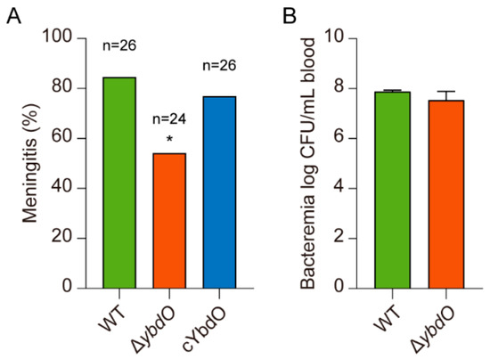 YbdO promotes E. coli K1-mediated meningitis without changes in high-level bacteremia. (A) Comparison of the number of animals with positive CSF cultures for E. coli between three groups receiving E. coli K1 WT, ΔybdO, and cybdO. (B) Deletion of ybdO did not affect the magnitude of E. coli K1 bacteremia in mice. Bacterial counts in the blood (log CFU/mL) were determined 4 h after intravenous injection of E. coli K1 strains via tail vein. Data were analyzed using (A) a two-sided Fisher’s exact test and (B) Student’s t-test. * p < 0.05.