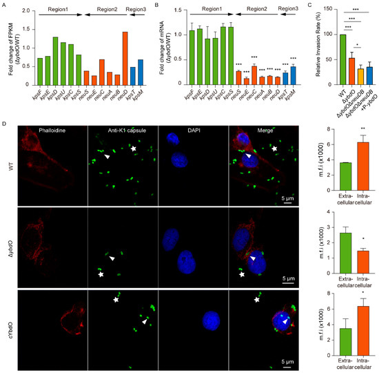 YbdO influences virulence by enhancing capsule production. (A) Altered transcription levels of K1 capsule genes following ybdO deletion. (B) Verification of the transcriptome data via qRT-PCR analysis of regions1, 2, and 3 in the K1 capsule. (C) Invasion rate of WT, ΔybdO, ΔybdOΔneuDB, and ΔybdOΔneuDB+P-ydbO E. coli K1 in HBMECs. The invasion abilities of the deletion strains were calculated relative to that of the WT strain. (D) Invasion by the WT, ΔybdO, and cybdO E. coli K1 strains according to immunofluorescence analysis of HBMECs. The actin cytoskeleton (red), K1 capsule (green), and nuclei (blue) are shown, intracellular bacteria are indicated by arrowheads, and extracellular bacteria are indicated by stars. Mean fluorescence intensity (m.f.i.) ± SD per bacterium per field in the intracellular (orange bars, n = 10) and extracellular samples (green bars, n = 10). (B–D) Data were obtained from three independent experiments and analyzed using Student’s t-test. * p < 0.05, ** p < 0.01, *** p < 0.001.