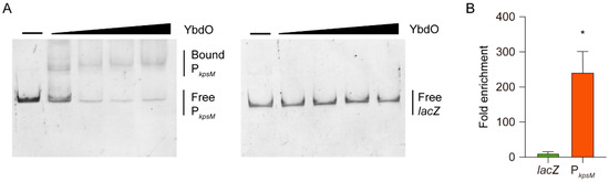 YbdO directly activates kpsM expression. (A) EMSA of the specific binding of YbdO to PkpsM and lacZ (negative control). PCR products were added to the binding buffer at 20 ng each, and YbdO protein was added to the reaction buffer (lanes 1–5) at 0, 0.15, 0.3, 0.6, and 1.2 μM. (B) Fold enrichment of PkpsM and lacZ in YbdO-ChIP samples. The fold enrichment of the YbdO-binding sites was measured based on the percent input of IP as compared with that of MOCK. Data were obtained from three independent experiments and analyzed using Student’s t-test. * p < 0.05.
