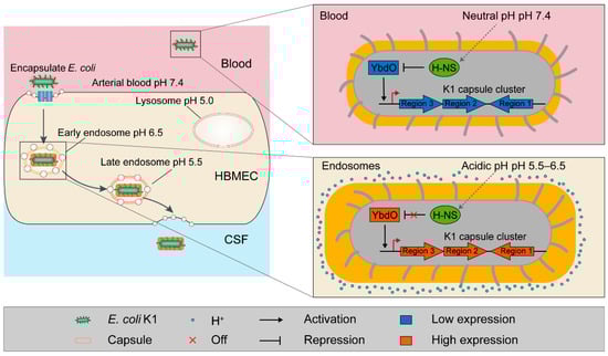 Model of the regulatory pathway of YbdO-mediated signaling in E. coli K1. In the blood, the pH is neutral (7.4), and H-NS binds to the ybdO promoter and represses ybdO expression, thereby inhibiting activation of capsule gene expression. In the endosomes of HBMECs, the pH is acidic (5.5–6.5), which induces H-NS detachment from the promoter to activate ybdO expression, allowing subsequent activation of capsule gene expression by YbdO to promote capsule production.