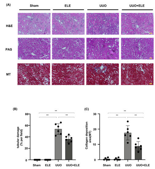2.1. β-Elemene Ameliorated Histopathological Alterations in UUO Mice