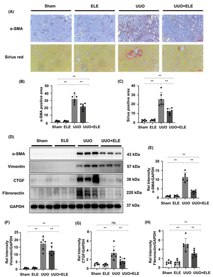 We analyzed α-SMA expression by immunohistochemistry and examined collagen I/collagen III deposition by Sirius staining (Figure 2A–C). Sham and ELE groups were largely devoid of deposition of these markers, and kidneys in the UUO group showed high expression of immunolabeling for α-SMA and collagen I/collagen III, which were attenuated in the UUO+ELE group. Further Western blot analysis confirmed that the fibrosis markers α-SMA, Vimentin, CTGF, and Fibronectin were largely absent in the sham and ELE group, expression of these marks was significantly elevated in the UUO group, and treatment with β-elemene significantly downregulated the expression of these markers (Figure 2D–H).