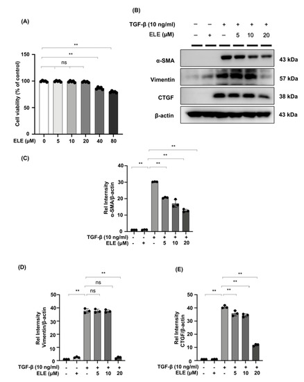 β-elemene inhibited TGF-β stimulated fibroblast activation in NRK49F cells. (A) Cells were treated with β-elemene for 24 h, and cytotoxicity assays were conducted. (B) Expression of α-SMA, CTGF, and vimentin in TGF-β stimulated NRK49F cells was detected by western blot and quantified by densitometry in a dose-dependent manner. Cells were pre-treated with β-elemene for 2 h after starvation with 0.5% FBS medium, treated with TGF-β (10 ng/mL) for 30 min, and incubated in 5% FBS medium for 24 h. (C–E) The Statistical significance was presented as the mean ± SD, n = 3. ** p < 0.01, ns: no significance. ELE, β-elemene.