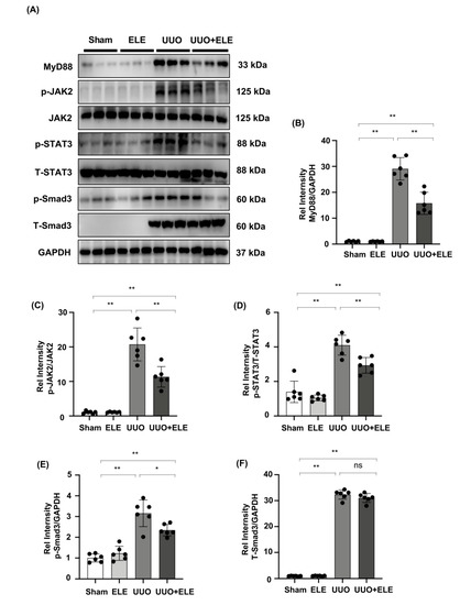 Increased phosphorylation of JAK2 and STAT3 was detected 7 days after UUO surgery, while the treatment with β-elemene reduced the activation of these signaling molecules. In addition, we found that Smad3 and MyD88 expression, as well as Smad3 phosphorylation, were enhanced in UUO kidneys compared to the sham and ELE group, and that these increases were diminished in the ELE+UUO group (Figure 4A–F).