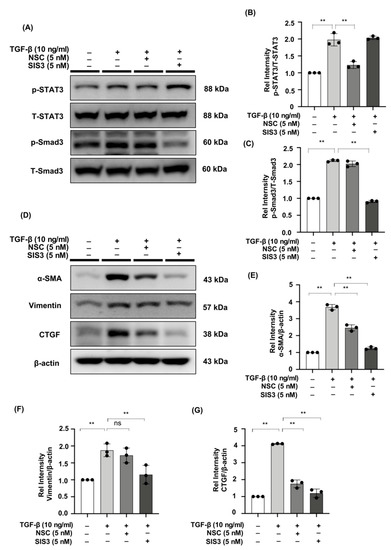 The STAT3 inhibitor, NSC, and the Smad3 inhibitor, SIS3, reduced the expression of fibrotic markers in TGF-β-stimulated NRK49F cells. (A) Expression of p-STAT3, T-STAT3, p-Smad3, and T-Smad3 in TGF-β-treated NRK49F cells with treatment of NSC and SIS3 was detected by western blot and quantified by densitometry. Cells were pre-treated with NSC and SIS3 for 2 h after starvation with 0.5% FBS medium and then treated with TGF-β (10 ng/mL) for 30 min. (B,C) Statistical significance was presented as the mean ± SD, n = 3. ** p < 0.01, ns: no significance. (D) Western blot demonstrated that NSC and SIS3 decreased the protein expression of α-SMA, vimentin, and CTGF in TGF-β stimulated NRK49F cells. NRK49F cells were treated with NSC or SIS3 for 2 h and then treated with TGF-β (10 ng/mL) for 30 min and incubated in a 5% FBS medium for 24 h. (E–G) Statistical significance was presented as the mean ± SD, n = 3. ** p < 0.01, ns: no significance.
