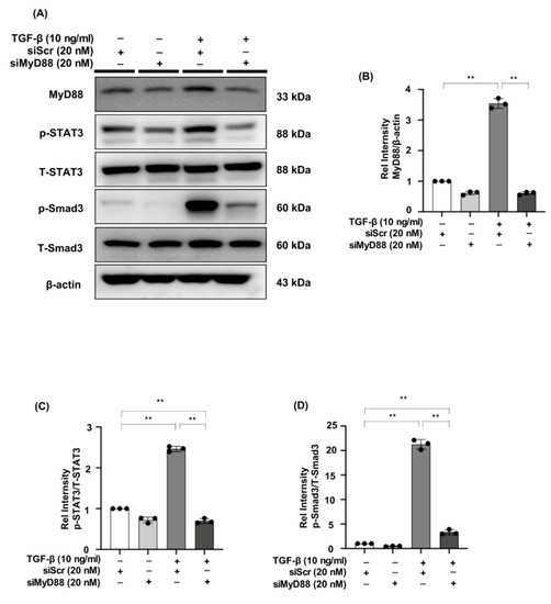 2.7. MyD88 Silencing Suppresses STAT3 and Smad3 Phosphorylation in TGF-β Stimulated NRK49F Cells