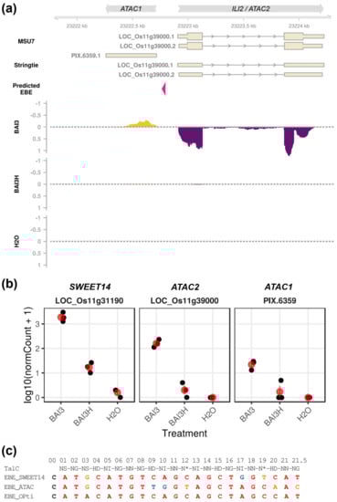 To generate a list of upstream sequences for EBE prediction, the DESeq2 gene list was arbitrarily further filtered to retain only the loci with a log2(FC) value ≥ 2 and an adjusted p-value ≤ 0.01 in both BAI3 vs. BAI3H and BAI3 vs. H2O comparisons. EBE predictions for the TalC RVD sequence on this set of upstream sequences (−500 bp to +200 bp relative to annotated gene start) used Talvez (v.3.2) with parameters “-t 0 -l 19” and default RVD–nucleotide association matrixes [].