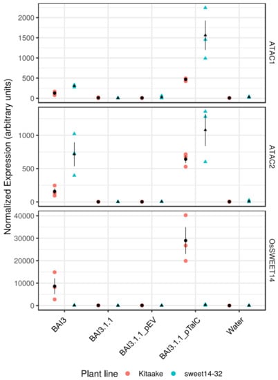 For the OsSWEET14 gene, qRT-PCR oligos were reported before []. For the ATAC locus, a primer pair specific to the ATAC1 transcript (GAGGTGGAGCTGGAGCTATG and TACAACGGGCTACAACCACA) and a primer pair specific to the ATAC2 transcript (CGTCCGATCTCGCCATCAAC and GAGAACATTTTAGGCCGACAGCA) were used. The elongation gene factor-1 alpha (GenBank: GQ848072.1) was used for normalization of the expression values of complementary DNA in each sample as before []. Normalized expression values were calculated with the 2−ΔCt methods, whereas expression ratios were calculated with the 2−ΔΔCt method.