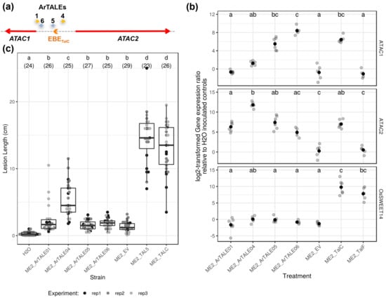 We, therefore, conclude that while our ArTALEs could simultaneously induce both ATAC1 and ATAC2 transcripts or ATAC2 alone, they did not consistently compensate for the loss of clade III OsSWEET induction and failed to confer increased virulence on the ME2 mutant strain in our conditions.