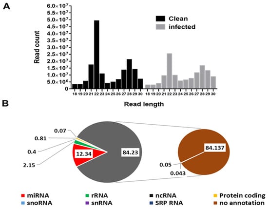 There were 216,292,174 raw small RNA reads from B. burgdorferi-infected salivary glands and 212,542,697 from uninfected salivary glands. After adapter trimming and removal of short reads (≤18 nucleotides (nt)), 133,465,828 small RNA reads were available from B. burgdorferi-infected samples and 163,852,135 from uninfected samples for downstream analysis. The read length distribution shows the types of small RNAs present in B. burgdorferi-infected and uninfected salivary gland samples. Two main peaks at 22 nt (miRNAs/siRNAs) at 29 nt (piRNAs) were distinguishable in B. burgdorferi-infected and uninfected samples (Figure 1A). There were ~5 × 107 and ~2.5 × 107 22 nt miRNA sequences in uninfected and infected salivary gland samples, respectively. The read length distribution in uninfected samples was comparable to infected samples.