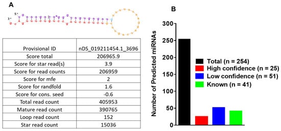 Figure 2A shows the basic hairpin-loop structure of an miRNA and other parameters (Dicer cut overhangs, total read count, mature read count, loop read count, total read count, randfold score, and total score) used to determine whether a hairpin-loop-structured RNA is an miRNA. Using miRDeep2, 254 miRNAs were predicted in the salivary gland libraries. By adopting a conservative approach, miRNAs were categorized as high- (n = 25) and low-confidence (n = 51) miRNAs (Figure 2B), based on standard criteria [,]. A conservative approach was used to annotate predicted miRNAs obtained from miRDeep2 analysis. The criteria utilized for annotating predicted miRNAs included: (1) a more significant number of deep sequencing reads corresponding to the mature sequence, (2) one or more reads matching to the star sequence, at least a few loop reads, (3) short 3′ duplex overhangs, characteristic of Drosha/Dicer processing, and (4) conservation of 5′ end of the potential mature sequence to a known mature sequence in the miRbase. The score boosts if the 5′ end of the potential mature sequence is identical to a known mature sequence. A high-confidence category will meet all the criteria mentioned above, whereas a low-confidence category will not satisfy all the criteria by missing one or two points. Of 49 Ixodes scapularis miRNAs present in miRBase, 41 were detected in our data. Of the 254 Ixodes scapularis miRNAs, several had homologs present in D. melanogaster. The details of the identified miRNAs and their miRDeep2 scores are presented in Supplementary Table S1.