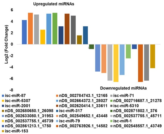 In the DE analysis, 11 miRNAs were upregulated and 12 were downregulated in infected salivary glands compared with uninfected salivary glands (Figure 3 and Table 1). Several of the identified tick miRNAs were conserved in D. melanogaster (dme-miR-375-3p, dme-miR-993-5p, dme-miR-12-5p, dme-bantam-3p, dme-miR-100-5p, dme-miR-8-3p, and dme-miR-304-5p). miRNAs downregulated in B. burgdorferi-infected salivary glands relative to uninfected salivary glands were isc-miR-153, isc-miR-1 and isc-miR-79, nDS_002871802.1_376, nDS_002633080.1_31953, nDS_002549652.1_43448, nDS_002537755.1_45711, nDS_002537755.1_45739, nDS_002861213.1_1750, nDS_002763926.1_14582, and nDS_002548557.1_43749, while upregulated miRNAs were isc-miR-317, isc-miR5310, isc-miR-2001, isc-miR-5307, isc-miR-71, isc-miR-87, nDS_002784743.1_12165, nDS_002664372.1_28027, nDS_002716687.1_21278, nDS_002620414.1_33611, and nDS_002680650.1_26098.