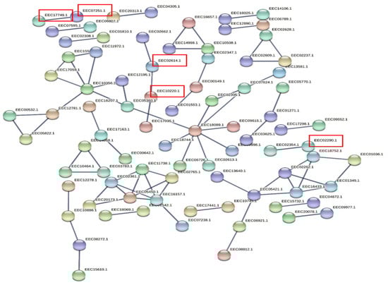 A network built exclusively from Ixodes scapularis proteins targeted by in silico differentially expressed miRNAs in Borrelia-burgdorferi-infected, partially fed salivary glands relative to partially fed clean salivary glands. Red boxes indicates the proteins involved in significant KEGG pathways such as sphingolipid metabolism (EEC07251.1, KEGG:R02541); valine, leucine, and isoleucine degradation (EEC10220.1, KEGG:R04188); lipid transport and metabolism (EEC02614.1, KEGG:R01178); exosome biogenesis and secretion (EEC07251.1, EEC17749.1, KEGG:R02541); and phosphate-containing compound metabolic process (EEC02290.1, KEGG:R00004).