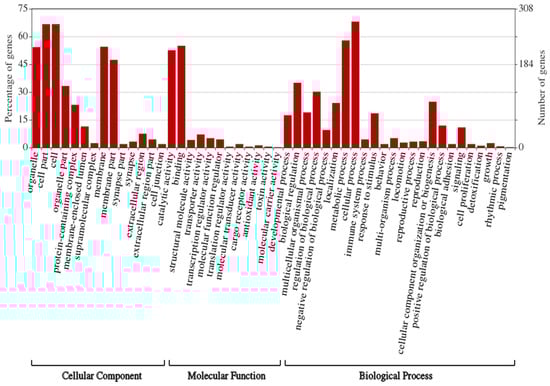 Many target genes were identified for the DE miRNAs using the sRNAtoolbox miRNAconsTarget program []. To minimize false-positive targets, we chose only those targets predicted by all three miRNA target-prediction algorithms (TargetSpy, MIRANDA, and PITA). Forty-one KEGG pathways were enriched for target genes (proteins) of DE miRNAs (Supplementary Table S2) and included sphingolipid metabolism; valine, leucine, and isoleucine degradation; lipid transport and metabolism; exosome biogenesis and secretion; and phosphate-containing compound metabolic processes (Figure 4). Gene ontology (GO) analysis indicated that most target genes of DE miRNAs play significant roles in cellular processes, metabolic processes, biological regulation, developmental processes, and responses to stimuli (Figure 5). Surprisingly, immune response genes were one of the least affected functions.