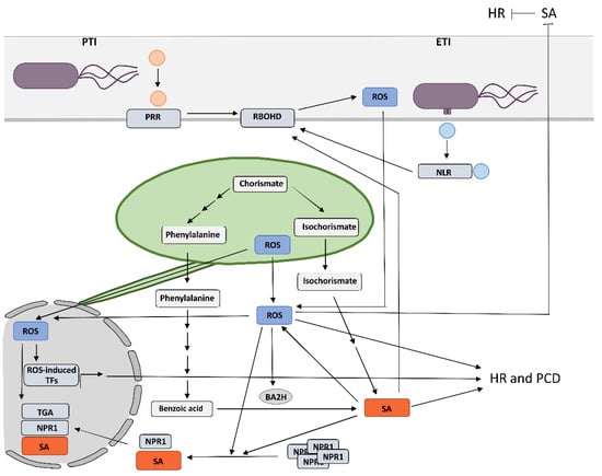In addition, the effective defense response strongly depends on the action of several plant hormones that ultimately reprogram the transcriptome. Among them, salicylic acid (SA) has been identified as one of the key components of the immune signaling []. Its crucial role, not only in ETI but also in PTI and systemic acquired resistance, have been extensively studied [,,].