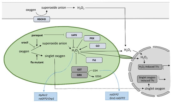 Tools to investigate the role of specific reactive oxygen species produced in chloroplasts and apoplasts. One strategy for studying the role of organelle-specific redox state is by altering reactive oxygen species (ROS) production by using chemicals or mutants (bold) or by altering expression of genes involved in ROS production (light grey). The role of apoplastic ROS could be studied by altering the expression of RBOHD. The role of chloroplastic ROS could be studied in transgenic plants with overexpressed tAPX, which results in decreased chloroplastic ROS production, or in transgenic plants with estrogen-inducible RNAi-silenced tAPX expression, which results in increased chloroplastic ROS production. As PRX similarly as APX reduce H2O2 accumulation, silencing of PRX results in enhanced chloroplastic H2O2 production. Fld improves the delivery of reducing equivalents to productive pathways of the chloroplast, which in turn restricts chloroplastic ROS production. Paraquat acts by re-directing electrons from photosystem I to oxygen and thereby enhances the production of superoxide in the chloroplasts but also inhibits APX, which leads to accumulation of H2O2 in treated plants. Flu mutant is used to study singlet-oxygen-specific ROS signaling. Uracil, acting as a chloroplast electron transport chain inhibitor, reduces H2O2 production. Different types of ROS induce specific transcriptional response. Another strategy for studying the role of organelle-specific redox state is by using biosensors (blue). roGFP2 and Grx1-roGFP2 targeted to chloroplasts measure chloroplast redox state, while roGFP2-Orp1 and HyPer-derived probes detect H2O2. RBOHD: respiratory burst oxidase homolog (RBOH) NADPH oxidases D, tAPX: thylakoidal ascorbate peroxidase, PRX: 2-Cys peroxiredoxin, GO: glycolate oxidase, Fld: flavodoxin, GRX: glutaredoxin, GST: glutathione S-transferase, GSSG: glutathione disulfide, GSH: glutathione.