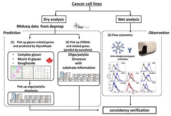 The strategy scheme of this study. For dry analysis, RNAseq data were used to predict oligo/polySia structures by picking up (1) glycan-related genes followed by the GlycoMaple and (2) ST8Sias and the related genes followed by our own method. For wet analysis, (3) flow cytometric analysis of the same cell lines used in dry analysis was performed. Based on the results, the consistencies of the observed and predicted sialoglycoconjugates were verified.