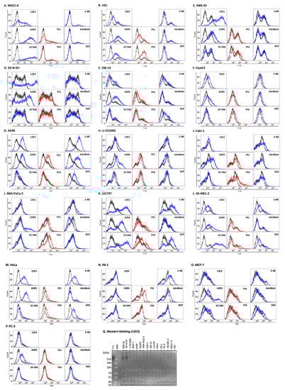 Flow cytometric analysis of cancer cell lines. Human cancer cell lines were analyzed by flow cytometry using eight different anti-sialoglycoconjugate antibodies. Cell surface expression profiles of sialoglycoconjugates are shown in (A) MOLT-4, (B) HEL, (C) IMR-32, (D) SK-N-SH, (E) U-251MG, (F) HepG2, (G) A549, (H) SW-13, (I) Caki-1, (J) MIA PaCa-2, (K) LS174T, (L) SK-MEL-2, (M) HeLa, (N) PA-1, (O) MCF-7, and (P) PC-3. Black lines, negative control (control antibody); blue lines, anti-sialoglycoconjugate antibodies (mouse IgM); red lines, anti-sialoglycoconjugate antibodies (mouse IgG). (Q) Western blot analysis of the cancer cell lines by 12E3 antibody for polySia–NCAM. P.C., positive control (pig embryonic brain homogenate); MW, molecular size markers.
