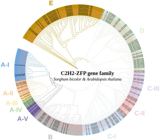The full-length protein sequences of S. bicolor and A. thaliana C2H2-ZFPs were used for phylogenetic analysis. Multiple sequence alignments were performed with MUSCLE (https://www.ebi.ac.uk/Tools/msa/muscle/, accessed on 25 October 2021), and the resulting sequences were trimmed using trimAl. Then, a phylogenetic tree was inferred using IQ-TREE with a bootstrap value of 1000. Apart from that, the phylogenetic tree was visualized and annotated by iTOL (https://itol.embl.de/, accessed on 30 October 2021).