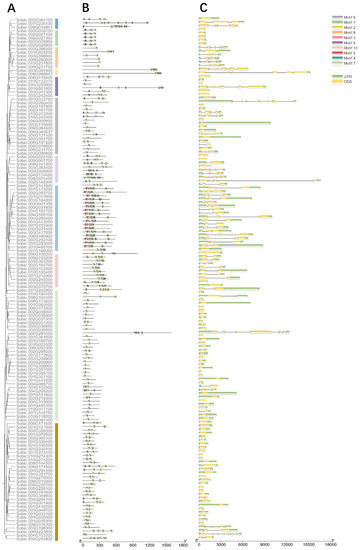 Motif distributions and gene-structure analysis of SbC2H2-ZFP genes. (A) The phylogenetic tree was built by the ML method with a bootstrap value of 1000. (B) The conserved motifs in SbC2H2-ZFP proteins (1–10) are in different colors. The black lines represent relative protein lengths. (C) Exons, introns, and untranslated region (UTR) are represented by yellow rectangles, gray lines, and green rectangles, respectively. The length of SbC2H2-ZFPs is shown below.