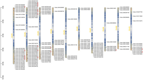 Chromosomal distribution of SbC2H2-ZFP genes was constructed according to S. bicolor genome information (Figure 3, Tables S1 and S3). There were C2H2-ZFP genes on each chromosome. Chr2 harbored the most SbC2H2-ZFP genes (32 genes, ~22.07%), followed by Chr1 (26, ~17.93%), while Chr5 contained the least (6 genes, ~4.14%). Chr3, Chr4, and Chr8 contained 19 (~13.10%), 15 (~10.34%), and 7 (~4.83%) SbC2H2-ZFP genes, respectively. Chr7 and Chr10 contained the same number of SbC2H2-ZFP genes (11 each, ~7.59%); furthermore, Chr6 and Chr9 each contained 9 (~6.21%) SbC2H2-ZFP genes. Moreover, if two genes were situated in the same chromosome within 100 kb of distance and separated by five or fewer genes, they would be regarded as tandemly duplicated genes [38]. As a result, we identified 19 tandem duplication events containing 33 SbC2H2-ZFP genes on Chr1, 2, 3, 8, and 10 (Figure 3). Interestingly, some SbC2H2-ZFPs participated in more than one tandem repeat event, such as Sobic.001G356800, Sobic.001G357000, Sobic.002G026800, Sobic.002G026900, and Sobic.002G036600. Moreover, all genes in tandem repeat events came from the same subfamily, suggesting the accuracy in the subfamily classification of the evolutionary tree (Figure 3, Table S3).