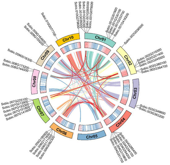 A schematic diagram of the synteny relationship of the SbC2H2-ZFP genes. Colors represent all collinear segments in the S. bicolor genome, and red lines represent duplicated C2H2-ZFP gene pairs. The outermost circle shows the chromosome number, and the second outer circle shows the density of each chromosome.