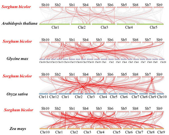 Synteny analyses of C2H2-ZFP genes between S. bicolor and four representative species. Gray lines represent the collinear regions within S. bicolor and other genomes, and red lines indicate the syntenic SbC2H2-ZFP gene pairs.