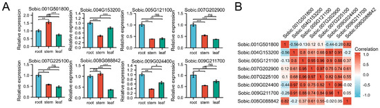 Tissue-specific expression of 8 SbC2H2-ZFP genes and the relevance of their expression. (A) Expression patterns of 8 SbC2H2-ZFP genes in root, stem, and leaf were analyzed by qRT-PCR. Error bars are obtained from three biological replicates, and standard error is selected as the value of the bar. Asterisks display significant expression differences of genes in different organs (* p < 0.05, ** p < 0.01, *** p < 0.001; one-way ANOVA). (B) Positive numbers: positive correlations; negative numbers: negative correlations.