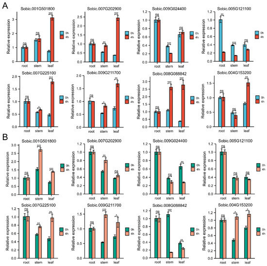 Total RNA of S. bicolor samples was extracted using a Plant RNA Kit (Omega Bio-tek Inc., Norcross, GA, USA) and reverse transcribed by a PerfectStart Uni RT&qPCR Kit (Transgen Biotech, Beijing, China). Specific primers were designed by Oligo 7.0 (Table S6). The qRT-PCR was conducted, and each selected gene was assayed at least three times. We used the EIF4α (eukaryotic initiation factor 4-α) gene as the control, the expression of which was stable in almost all growth stages and tissues [66]. The expression data were calculated according to the 2−(ΔΔCT) method and visualized using R 3.6.3 with the ggplot2 package (Version 3.3.5, Wickham, 2016, https://cran.r-project.org/web/packages/ggplot2/index.html, accessed on 5 September 2021).