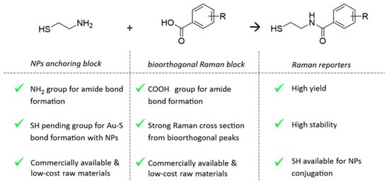 New molecular entities acting as bioorthogonal RRs were rationally designed to show (i) high Raman cross section, (ii) strong single narrow vibrational peaks in the biological silent region (1800–2800 cm−1), and (iii) proper pending functional groups to be attached to AuNPs avoiding alteration of colloidal stability. To this end, as depicted in the scheme in Figure 1, the RRs are conceived as constituted by two building blocks covalently coupled together: the “NPs anchoring block” and the “bioorthogonal Raman block”. The “NPs anchoring block” should contain at least a thiol end-chain group for NPs covalent conjugation by Au–S bond formation and a second pendant functional group for covalently coupling with the “bioorthogonal Raman block” (Figure 1). With the purpose of developing a very modular, efficient, and versatile synthesis, we selected the amide bond formation as a coupling reaction. To this end, raw cysteamine 1 was identified as “NPs anchoring block”, as the amine functional group was exploited to couple selected benzoic acid derivatives through standard peptide bonds formation. For the bioorthogonal Raman block, benzoic acids were preferred to aliphatic carboxylic acids since the π-electrons of the aromatic rings are characterized by high polarizability leading to a higher Raman scattering cross section []. Indeed, our approach enables us to customize a library of bioorthogonal RRs by simply exploring varied benzoic acid derivatives in the synthesis.