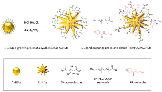 SH-PEG-COOH and RR molecules were exploited in a ligand-exchange process to replace the citrate layer with PEG in citrate-capped nanostars (Cit-NSts). AuNPs solution was diluted to 2 nM, and the same volume of 1 mM SH-PEG-COOH aqueous solution was added together with 2 µL of different concentrations of RR molecules in ethanol. Conditions are reported in the table in Figure S5. The solution was left stirred at RT for at least 2 h, then centrifuged at 25 °C, 2500× g rpm for 40 min, and redispersed in milliQ water or PBS for further bioconjugation. The concentration of particles was determined according to a formula reported by the method of De Puig et al. [].
