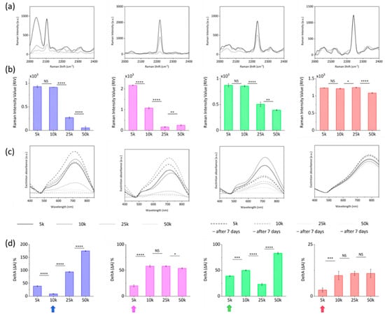 To this end, while PEG/NP ratio was kept constant at 500 k to achieve the 100% particle coverage as previously demonstrated [], different RR/NP ratios were investigated to study the effect of RRs at 5 k, 10 k, 25 k, and 50 k ratios. Optimal PEG/NPs/RRs incubation conditions were those giving brighter bioorthogonal Raman signals while retaining SERS nanotags morphology and avoiding particle aggregation. From this perspective, Raman and UV-Vis absorption spectra were acquired over time for different batches (Figure 4). Experimental data were analyzed as a function of RRs loading in terms of the Raman Intensity Value (RIV) parameter, which quantifies the intensity of the specific bioorthogonal peaks, and DeltA parameter, defined as the percentage of variation of the NPs resonant peak within 7 days. The highest RIVs combined with the lowest DeltAs identify the RR@NPs working window conditions. As shown in the graphs in Figure 4a,b, despite the decrease in the Raman signal when passing from 5 k to 10 k, RIVs for RR1 and RR3 @AuNSts 10 k did not significantly vary with respect to 5 k (NS), indicating a slight variability between 5 k and 10 k conjugation process. Conversely, in the same range from 5 k to 10 k, RIV for RR2@AuNSts significantly decreased (p < 0.0001). For RR/NP ratios higher than 10 k RIVs for RR1, RR2, and RR3 dramatically decreased (p < 0.0001). Finally, RR4@AuNSts showed high signal stability at all RR/NP ratios. With respect to the DeltA parameter, the graphs in Figure 4c,d clearly display that for RR1, RR2, and RR3, colloidal stability was immediately lost after the conjugation processes, as related UV-Vis spectra were characterized by flat, broad, and red-shifted curves, stating for uncontrolled aggregation phenomena. This supports the hypothesis that at higher ratios, there are too many RR molecules adhering to gold and competing with PEG stabilizing agent in decorating NPs surfaces, thus affecting PEG steric-stabilization layer efficacy and causing NPs clustering through irreversible interactions. Finally, in the 5 k–10 k range, improved stability at 7 days was observed for RR1, RR2, and RR3 @AuNSts, while again, negligible changes were measured for RR4 @AuNSts at all ratios. Finally, according to experimental data, RR/NP optimal ratios were 10 k for RR1 and 5 k for RR2, RR3, and RR4.