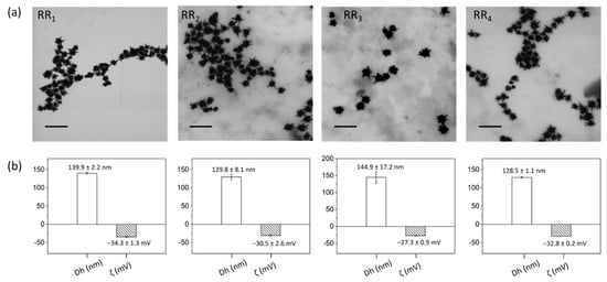 (a) TEM images, (b) size distribution (Dh), and zeta potential values (ζ) of RR@AuNSts acquired after the implementation of the optimized RRs conjugation. Scalebar is 200 nm in all cases.