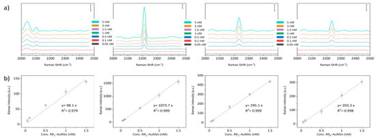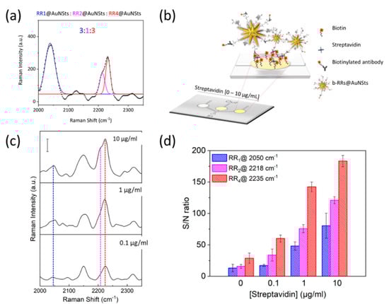 Finally, proof-of-concept experiments were implemented to investigate the possibility of exploiting SERS nanoprobes for multiplexing analysis. To this end, we first verified that characteristic signals from the engineered probes were still distinguishable even upon their mixing. As shown in Figure 8a, the bioorthogonal peaks of each tag could be clearly identified when acquiring SERS spectra of RR1@AuNSts, RR2@AuNSts, and RR4@AuNSts solution. The 3:1:3 mixing volume ratio was selected to have a starting RRs mixture with comparable Raman intensity from each tag. RR3@AuNSts was not considered since it was completely hindered by the RR4@AuNSts signal (Figure S2). This is due to the broadening of the peaks resulting when moving from raw RRs powder to their corresponding nanoconstructs. Then, the potential multiplexing properties of the RR@AuNSts mixed solution were verified in biologically relevant tests, such as biotin–avidin immunoassays used in standard clinical practices. To this end, RRs@AuNSts exposing biotin moieties (b-RRs@AuNSts) were obtained without affecting SERS nanoprobes properties (Figure S3). Then, biotin-modified polymeric substrates were prepared and further incubated with streptavidin, whose tetrameric structure was exploited for further self-assembling of b-RRs@AuNSts through incubation (Figure 8b). Streptavidin concentration was decreased from 10 µg/mL to 0.1 µg/mL, and Raman-SERS spectra were acquired in random single points of the PDMS assay. For all the concentrations tested, raw spectra presented the RR@AuNSts peaks at 2050 cm−1, 2218 cm−1, and 2235 cm−1, thus attesting that multiplexing behavior, previously tested in solution, was preserved even when implemented on immunoassay. No spurious signal from the background could interfere (Figure 8c), apart from the peak at 2150 cm−1 ascribable to a stretching vibration frequency coming from the polymeric device (Figure S4). By plotting the Raman intensity of each bioorthogonal peak, in terms of S/N ratio, against streptavidin concentrations (Figure 8d), the same trend of decreasing Raman intensity with decreasing concentration was successfully observed for all the three probes. Furthermore, RRs characteristic signals were detectable even down to 0.1 ug/mL, thus in accordance with the LODs of the systems. Preliminary results support the potentiality of SERS bioorthogonal tags for background-free multiplex and quantitative detection of liquid samples.