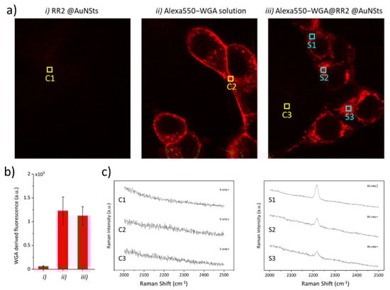 In vitro experiments were performed to demonstrate that bioorthogonal SERS nanoprobes can be further modified to tag specific analytes, even in heterogeneous and molecular complex systems, such as cell cultures. As a matter of fact, we report the first example of bioorthogonal RRs SERS nanoprobes showing simultaneously multiple functionalities as cases from literature are either based on RRs molecules not available for direct covalent absorption on SERS NPs or do not provide pendant groups for further conjugation with molecules for biological targeting. For this experimental study, brighter RR2@AuNSts was used for demonstration, and -COOH NPs-pendant moieties from assembled PEG were exploited to conjugate Alexa550-WGA, a fluorescent probe selectively tagging cellular membrane proteins. Incidentally, the implemented bio-functionalization protocol is based on standard peptide bond formation, thus exploitable to conjugate all capturing agents exposing amino functionalities. HEK cell cultures were incubated for 1 h with Alexa550-WGA-RR2@AuNSts and then washed thoroughly with PBS buffer to remove unbound SERS probes. Cells incubation with bare RR2@AuNSts and free Alexa550-WGA solution were performed as controls. As shown in the confocal images reported in Figure 7a, the fluorescence signal from Alexa550-WGA was observed for cells incubated in the presence of WGA, while no signal was observed when incubating with bare RR2@AuNSts. Furthermore, the fluorescence intensity from cells incubated with free Alexa550-WGA solution was comparable with that from cells incubated with Alexa550-WGA-RR2@AuNsts (Figure 7b). This attested to the high selectivity and specificity of the SERS constructs and, more importantly, demonstrates that the conjugation to RRs@AuNSts does not interfere in the WGA tagging process of the protein’s membrane. Then, the Alexa550-WGA fluorescence signal was exploited to localize SERS constructs and to acquire Raman spectra from cells incubated with Alexa550-WGA-RR2@AuNSts and fixed with paraformaldehyde solution since this would not interfere with the measurements in the biological Raman-silent region. Figure 7c displays representative SERS spectra from different regions in the cell cultures, marked with colored squares in Figure 7a (C states for control, S for sample). As shown, spectra obtained from controls C1, C2, and C3 revealed no peak characteristic for RR2. Contrariwise, the SERS spectra clearly revealed the strong narrow peak characteristic of the RR2 when focusing on the cell membranes (marks S1–S3). Successful colocalization of fluorescence and Raman signal paves the way for the exploitation of these RRs@AuNSts for immuno-SERS microscopy.