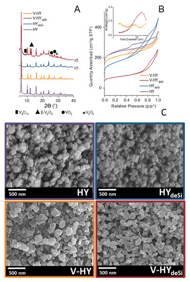 The zeolitic crystalline structure of the pristine HY material is preserved upon dispersion of the vanadium phase. The absence of XRD peaks from vanadium species point to their amorphous nature or formation of the crystallites of the vanadium phase small enough to be below the XRD detection limit. In contrast, the wet impregnation procedure of the vanadium species deposition on the desilicated zeolite results in an appearance of the silica–amorphous phase to some extent. This effect is not surprising as the re-aluminated surface of HYdeSi is susceptible to the acidic environment (applied in the vanadium phase deposition stage). The presence of vanadium crystalline moieties is identified in V-HYdeSi by the additional peaks at 2θ = 9°, 12°, 25°, 27°, 29° attributed to V6O13, β-V2O5, VO2, and V2O5, respectively (Figure 1A) [39].