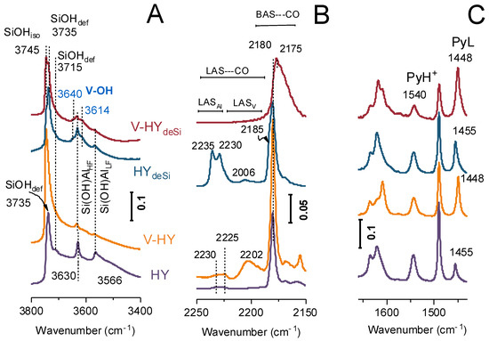 The overall acidic property picture was obtained from quantitative Py sorption FT-IR studies. Starting from Al molar concentration of 430 μmol·g−1 for the HY, the 303 μmol·g−1, i.e., 70% of the Al atoms are detected by Py sorption (Table 1, B + L, sum of Brønsted and Lewis sites). The caustic leaching reduced the number of protonic sites by 18% producing a twofold higher number of the Lewis sites. The deposition of the V species contributed to the consumption of the Brønsted acid sites by ca. 70% and 45% in V-HY and V-HYdeSi, respectively. At the same time, the number of Lewis sites, which can be assigned to the vanadium centres, increased. Assuming that the deposition of the V-phase implies the appearance of additional Lewis centres, the concentration of the Lewis V sites was calculated as the difference between the number of Lewis centres in the V and H zeolites (Table 1, LASV). In terms of absolute values, the V-HY possess the highest concentration of V-originating electron acceptor sites. One should have in mind, however, that the concentration of the native Lewis sites in the HYdeSi zeolite (those originating from the aluminium atoms) was affected by the formation of new Lewis acidic property of the V-Al-O-phases of a very low strength [44]. However, the share of vanadium sites able to bond Py expressed per 1 m2 is still higher for V-HYdeSi. The abovementioned considerations are fully consistent with the results of the CO sorption. Furthermore, the inspection of the spectra of Py interaction with the surface acid sites clearly points to the appearance of the weak acid sites in both V-HY and V-HYdeSi. The strong Lewis acid sites (PyL adduct band at 1455 cm−1) in H-zeolites are replaced with the V sites of significantly lower strength (PyL adduct band at 1448 cm−1) (Figure 1C). The significant drop of the strength of the protonic sites both in the desilicated and the vanadium-deposited materials is manifested by the Py thermodesorption data (BAS Py450/Py170b–Table 1).