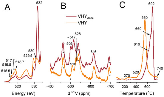 Figure 4A presents XAS spectra for vanadium supported on the pristine HY (A) and the desilicated HYdeSi (B) zeolites. The measured XAS spectra are split into three-line groups. The vanadium lines reflect the spin–orbit splitting (approximately 6.7 eV) and comprise the V L3-edge in the energy range 515–518 eV, corresponding to transitions from V 2p3/2 to V 3d, and the V L2-edge, at approximately 525 eV, corresponding to transitions from V 2p1/2 to V 3d. The third group, above 528 eV, is the O-K-edge, corresponding to transitions from O 1s to O 2p.