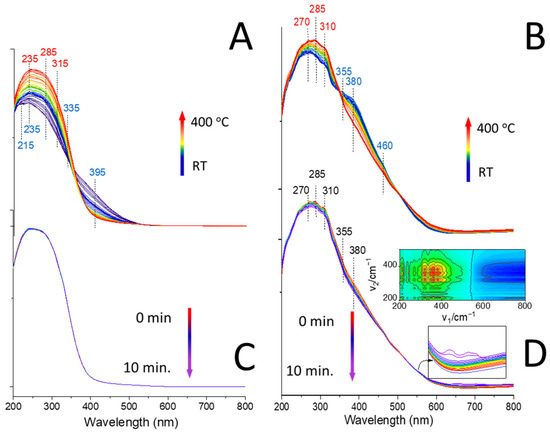 The DR UV-vis spectra of V-HY (A,C) and V-HYdeSi (B,D) collected during the thermal pretreatment in synthetic air flow (A,B) upon contact with propane at 400 °C (C,D). The 2D COS UV-vis maps as inserts.