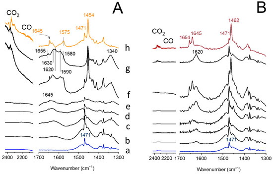 In situ FT-IR spectra collected during propane ODH process over V-HY (A) and V-HYdeSi (B) presented in 2400–2050 cm−1 (CO and CO2) and 1700–1300 cm−1 (surface adsorbed species) spectral ranges: gaseous propane at RT (a), propane on the catalyst at RT (b), propane and O2 (c) at RT, (d) at 200 °C, (e) at 350 °C, (f) upon reaction at 350 °C and cooled down to RT, (g) upon desorption at RT, and (h) the spectrum of gaseous species formed during process.