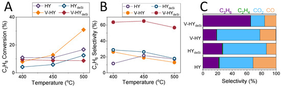 The V zeolites were tested in the oxidative dehydrogenation of propane and their catalytic activity was then discussed in terms of the speciation of vanadium sites. Figure 7A illustrates a performance of the V catalysts in different reaction temperatures. Attained low conversions (below 40%) in the studied temperature range (400–500 °C) are typical for the studied process [61,72]. The V catalysts show comparable conversion rates: 8.9% and 12.8% for V-HYdeSi and V-HY, respectively. Similar conversion at 400 and 450 °C is also observed for the native HY evidencing that the ODH active V sites are not offered by the V-HY material at these temperatures.